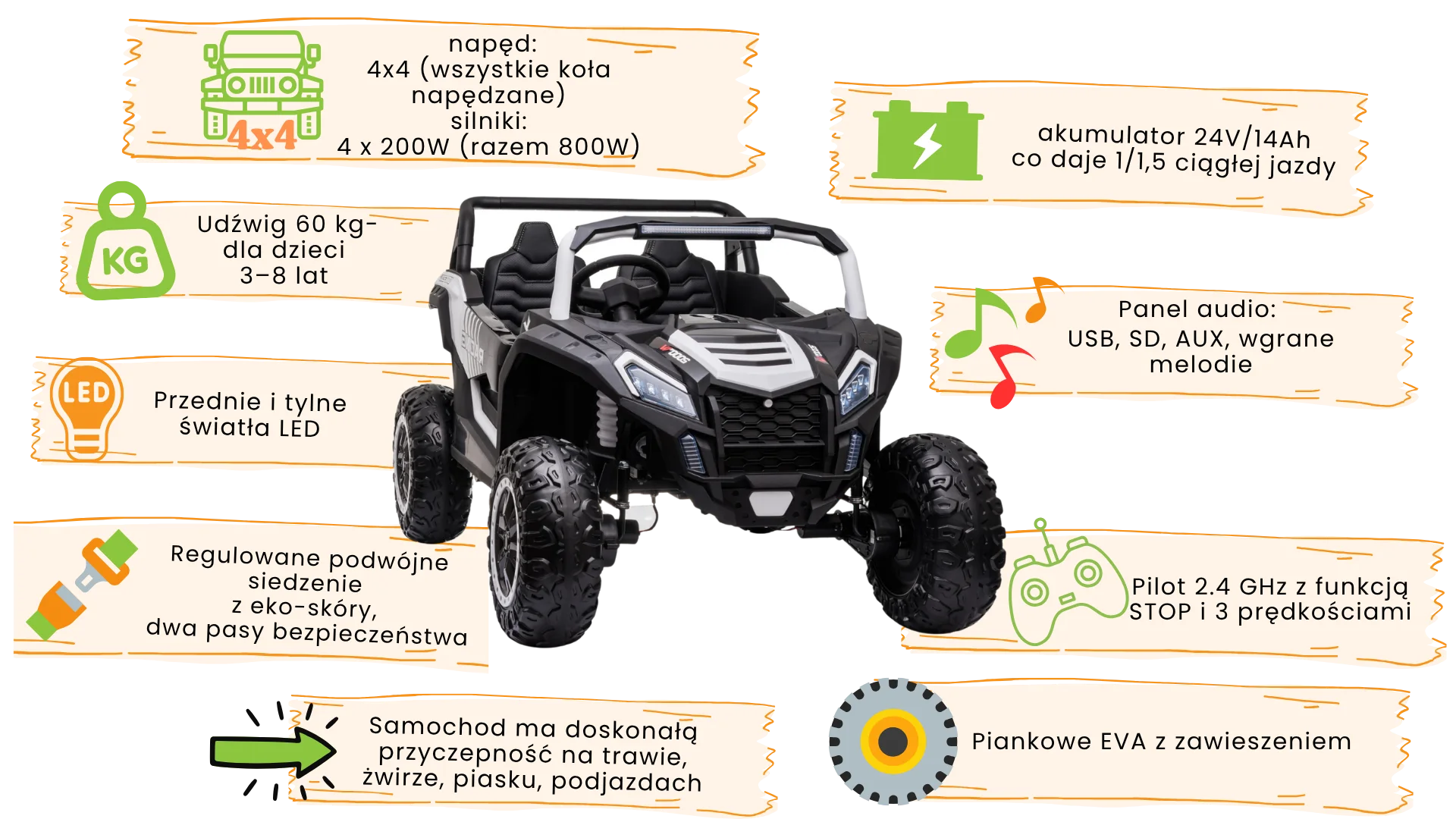 | Buggy 4x4 białe | 4x4 (4 silniki) | 800W (4x200W) | MP3/USB/SD/AUX | TAK (STOP + 3 prędkości) |