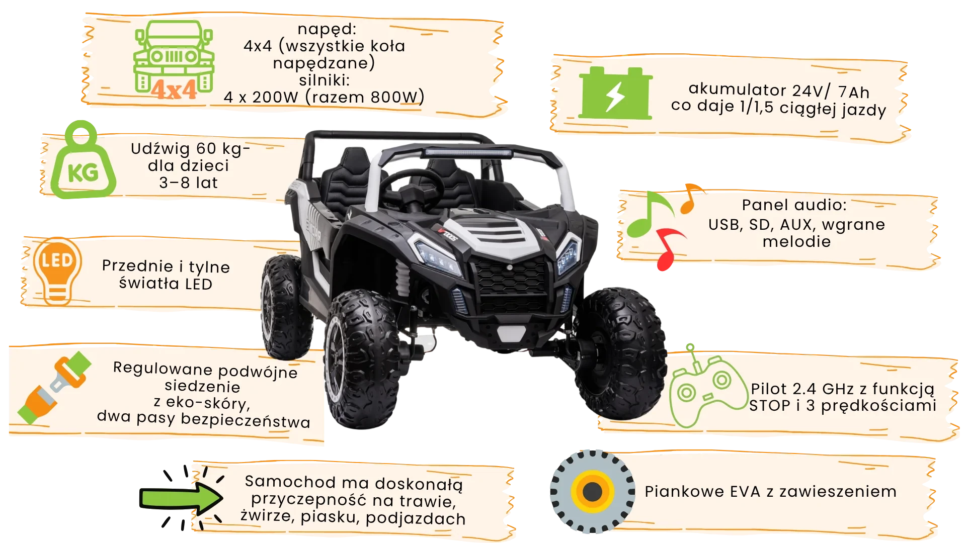 Największą zaletą jest połączenie mocy terenowej z estetyką premium - 800W daje pewność że buggy pojedzie wszędzie gdzie dziecko chce, a elegancka biała kolorystyka sprawia że pojazd wyróżnia się stylem. Pilot z trzema trybami prędkości pozwala rodzicom stopniowo wprowadzać dziecko w świat terenowej jazdy od bezpiecznych 3 km/h do dynamicznych 6 km/h. Panel audio z USB/SD/AUX, otwierane drzwi, koła piankowe EVA, funkcja płynnego startu i ponadczasowy biały kolor to dodatki doceniane zarówno przez dzieci jak i rodziców. Jeśli szukasz buggy na akumulator dla dzieci z prawdziwym napędem 4x4, mocą terenową i elegancją premium - to białe buggy 4x4 zasługuje na szczególną uwagę. To wybór dla rodzin z dostępem do terenu (działka, ogród, park), które chcą zapewnić dziecku aktywną zabawę na świeżym powietrzu w pojeździe łączącym funkcjonalność z ponadczasowym stylem.