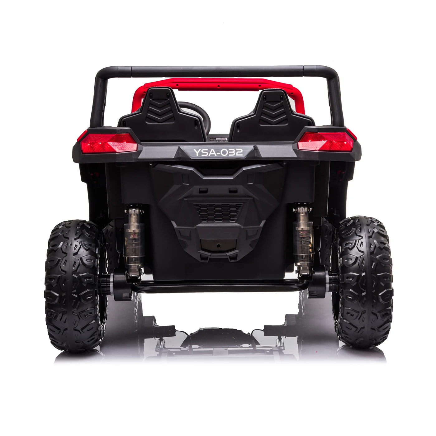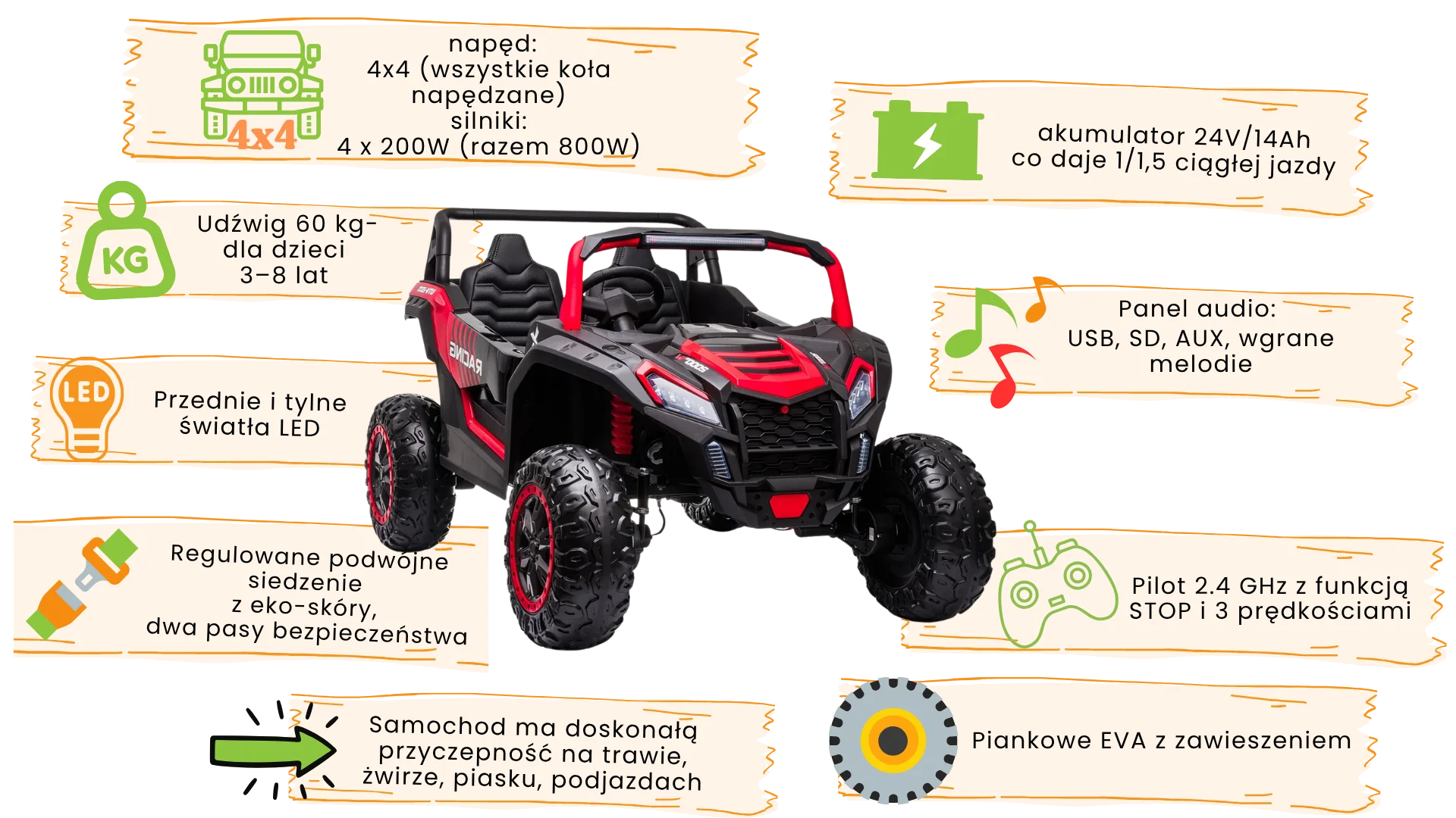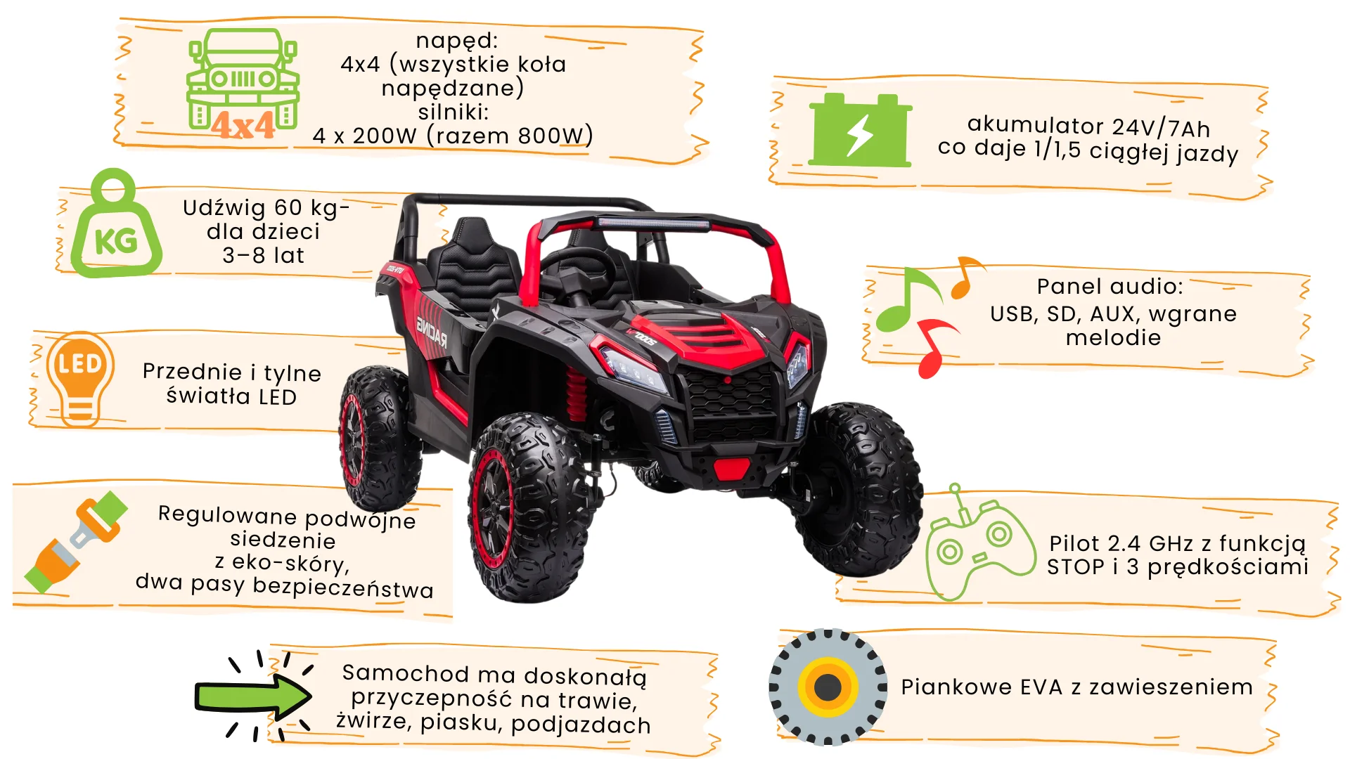 Koła EVA piankowe z zawieszeniem na wszystkich czterech kołach, otwierane drzwi, regulowane siedzenie z dwoma pasami bezpieczeństwa sprawiają, że jazda jest nie tylko ekscytująca, ale i bezpieczna i komfortowa. Panel audio z USB, SD, AUX i wgranymi melodiami pozwala na odtwarzanie muzyki z pendrive lub telefonu podłączonego kablem - każdy rajd może mieć własną ścieżkę dźwiękową. Światła LED z przodu i tyłu dodają sportowego charakteru i zapewniają widoczność podczas wieczornych sesji na działce czy w ogrodzie. Maksymalne obciążenie 30 kg sprawia, że buggy sprawdzi się dla dzieci w wieku 3-8 lat - od przedszkolaków po wczesnoszkolaków szukających mocniejszego pojazdu.