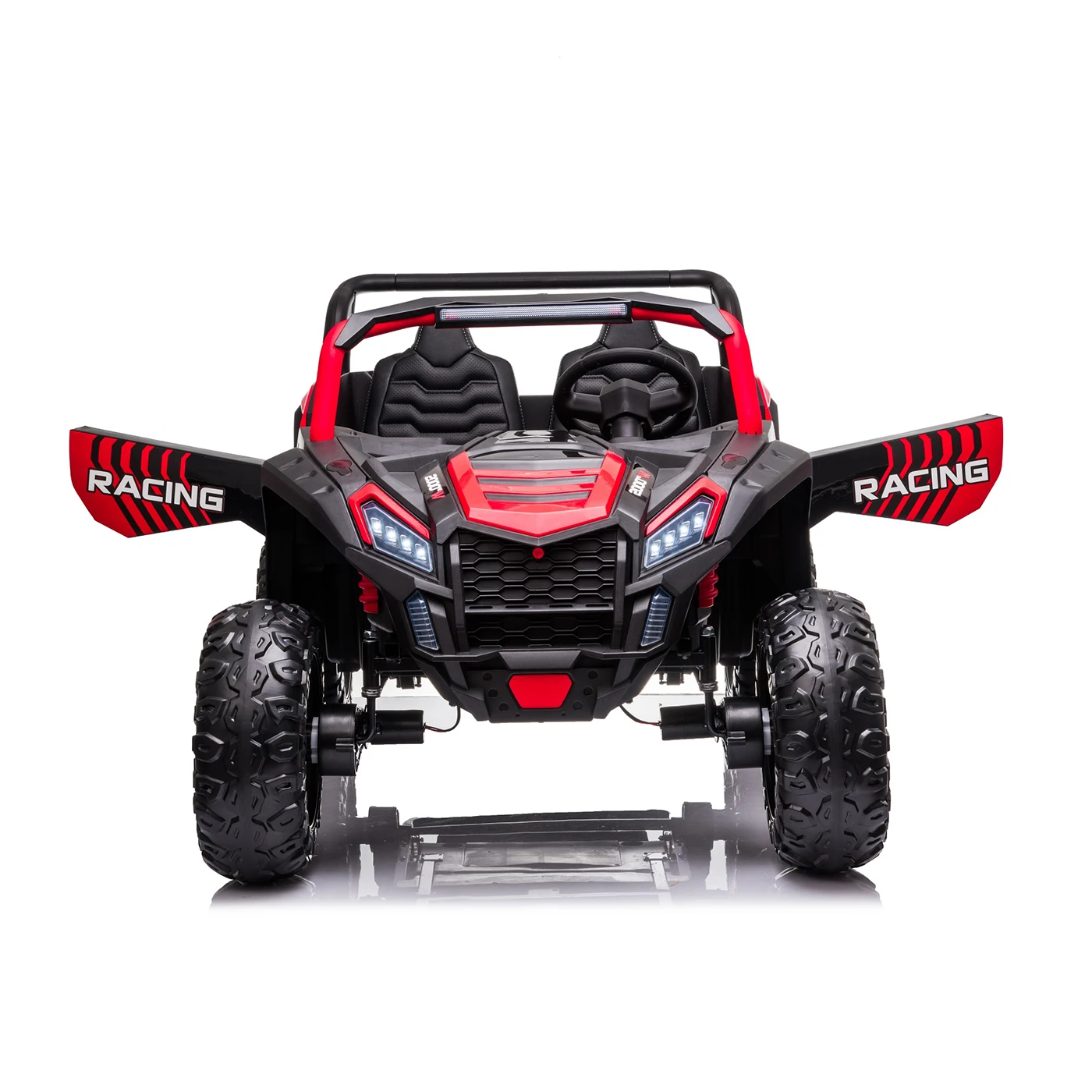 Buggy wyróżnia się sportowym, masywnym designem - czerwone nadwozie z czarnymi akcentami, zawieszenie na wszystkich kołach i szeroki rozstaw kół EVA piankowych jak w prawdziwych buggy wyścigowych. Przednia część ma agresywny grill z dużymi reflektorami LED, które włączają się przyciskiem na konsoli. Tylne światła LED dodają sportowego charakteru i poprawiają widoczność. Boczne profile są wzmocnione plastikowymi klatkami bezpieczeństwa - bardziej dla estetyki niż funkcji, ale dodają sportowego charakteru.