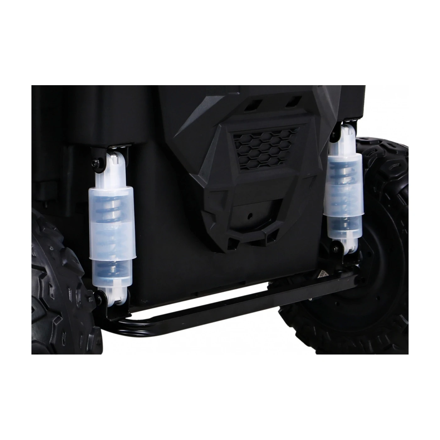 Wyjaśnienie: Pianka EVA ma naturalne właściwości amortyzujące - jest miększa niż plastikowe koła, ale twardsza od pompowanych. Nie trzeba ich pompować i nie grozi im przebicie kolcem czy gwoździem. Zawieszenie na wszystkich czterech kołach to sprężyny i amortyzatory pracujące niezależnie - gdy jedno koło najeżdża na kamień, tylko ono się unosi, a nadwozie pozostaje stabilne. W praktyce dziecko jedzie komfortowo nawet po polnej dróżce pełnej nierówności. Głęboki bieżnik kół poprawia przyczepność na trawie, piasku i żwirze - wyprofilowane bruzdy odprowadzają wodę i zwiększają kontakt z podłożem.