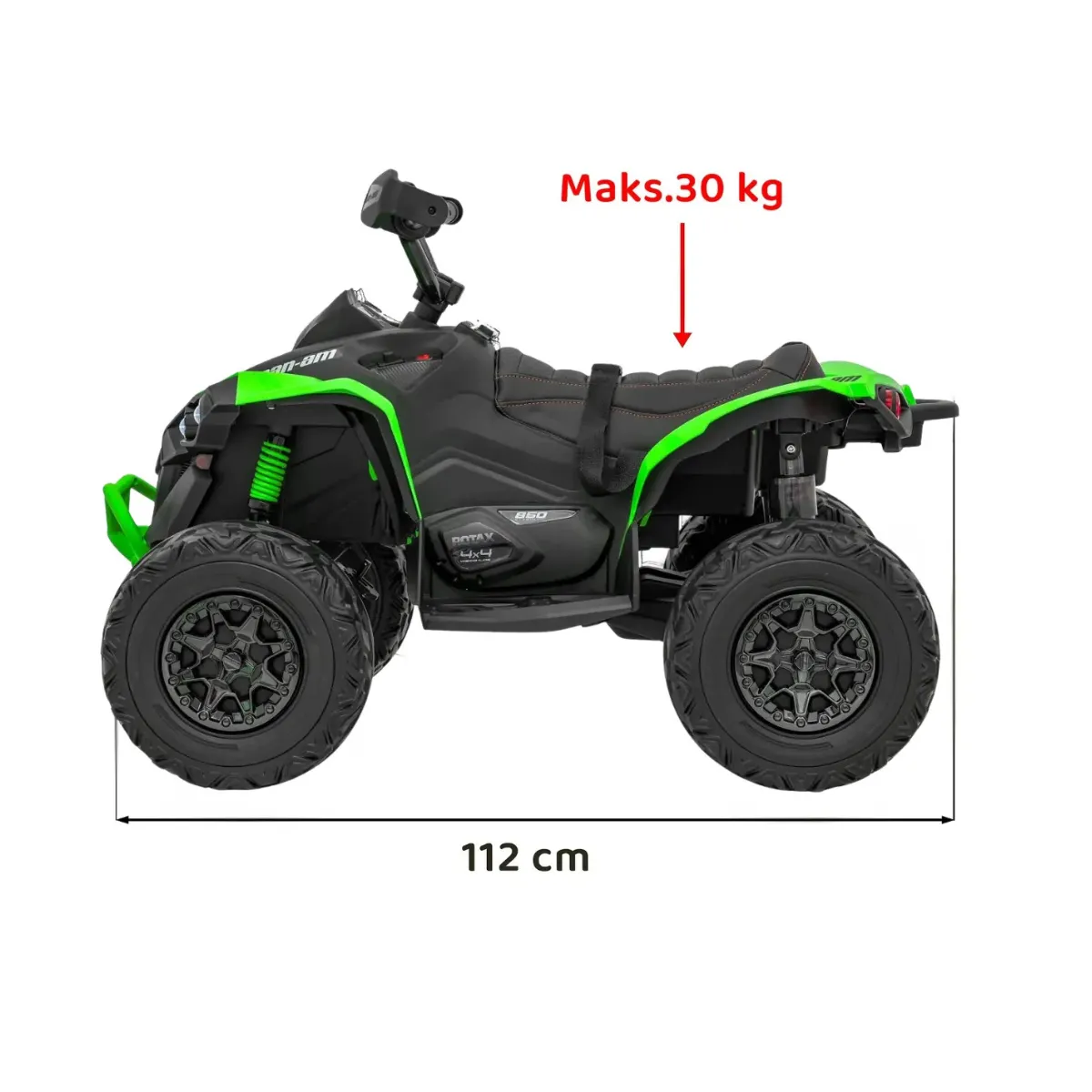 Konstrukcja quada elektrycznego na akumulator opiera się na wzmocnionej stalowej ramie o wymiarach 112 x 64 x 74 cm. Niska sylwetka i szeroka rozstawa kół (64 cm) zapewniają niski środek ciężkości, co znacząco zmniejsza ryzyko wywrócenia podczas ostrych zakrętów. Waga własna 17 kg sprawia, że pojazd jest stabilny, ale nie na tyle ciężki, aby uniemożliwić transport przez dorosłego - z tyłu znajduje się specjalny uchwyt transportowy.