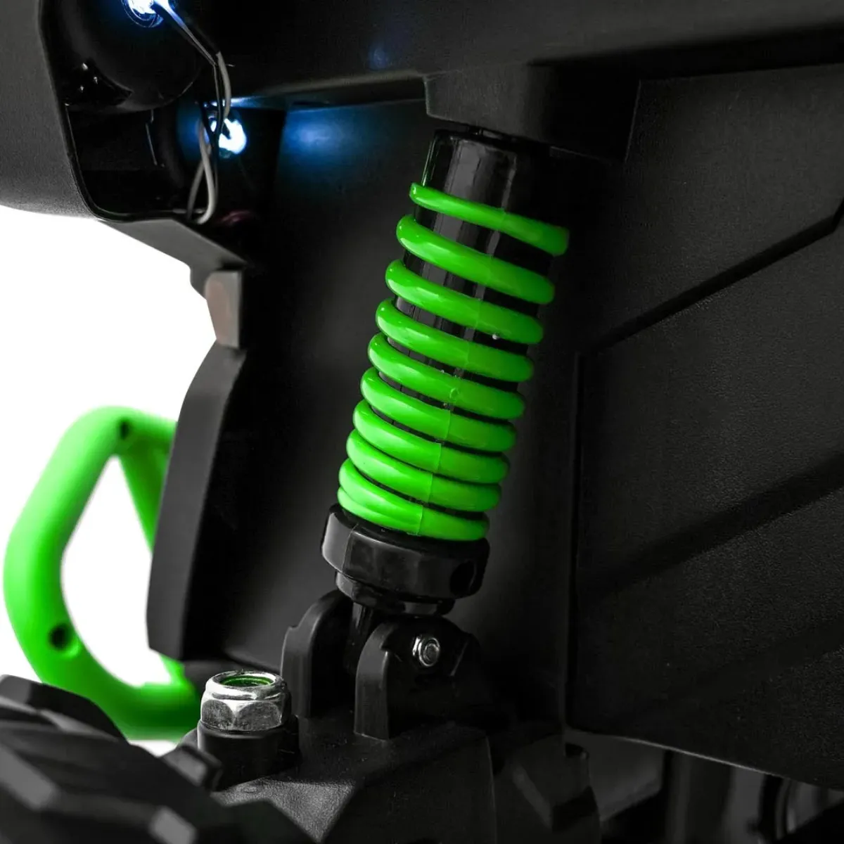 Ten quad elektryczny dla dzieci w energetycznym kolorze zielonym to idealny wybór dla młodych odkrywców w wieku 3-8 lat. Maverick ATV wyposażony w dwa silniki po 200W (łącznie 400W mocy), cztery amortyzatory i zaawansowany system audio z Bluetooth to połączenie mocy, komfortu i nowoczesnych technologii. Prześwit 18 cm i duże koła EVA 31x13 cm gwarantują pewność jazdy po trawie, utwardzonej ziemi i leśnych ścieżkach. Soczyście zielony kolor idealnie komponuje się z przyrodą i dodaje pojazdom dynamicznego charakteru.
