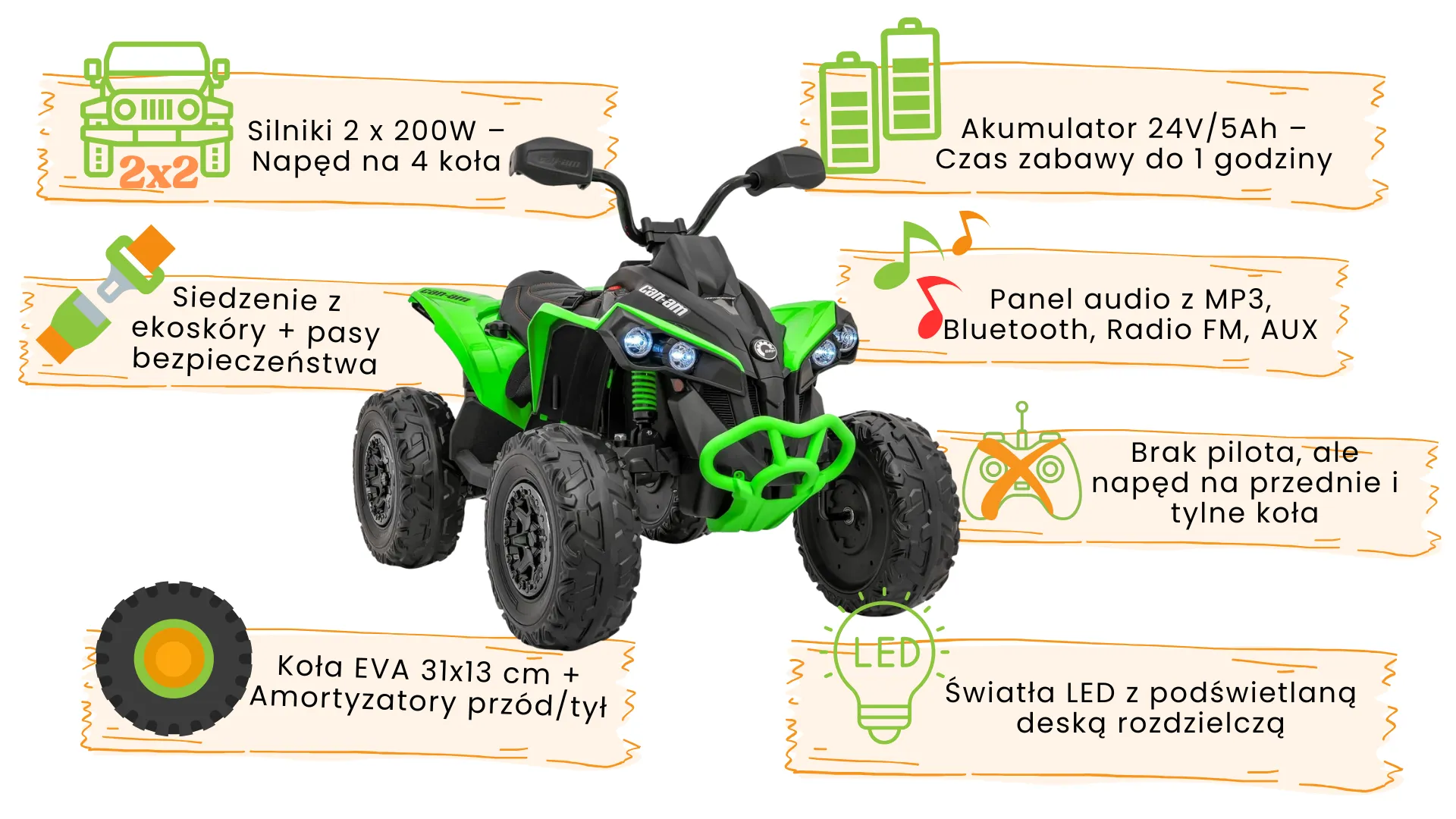 Pojazd wyposażono w panel multimedialny obsługujący Bluetooth, MP3, radio FM, USB i AUX - dzieci mogą słuchać ulubionej muzyki podczas jazdy terenowej. Włącznik startowy odtwarza realistyczny dźwięk uruchamiania silnika, a wgrane melodyjki dodatkowo uatrakcyjniają zabawę. Siedzenie z czarnej ekoskóry łączy elegancję z praktycznością - jest wygodne i łatwe w czyszczeniu. Funkcja wolnego startu eliminuje szarpnięcia przy ruszaniu, co zwiększa bezpieczeństwo najmłodszych kierowców. Światła LED z przodu i z tyłu oraz podświetlana deska rozdzielcza nadają quadowi profesjonalny wygląd.