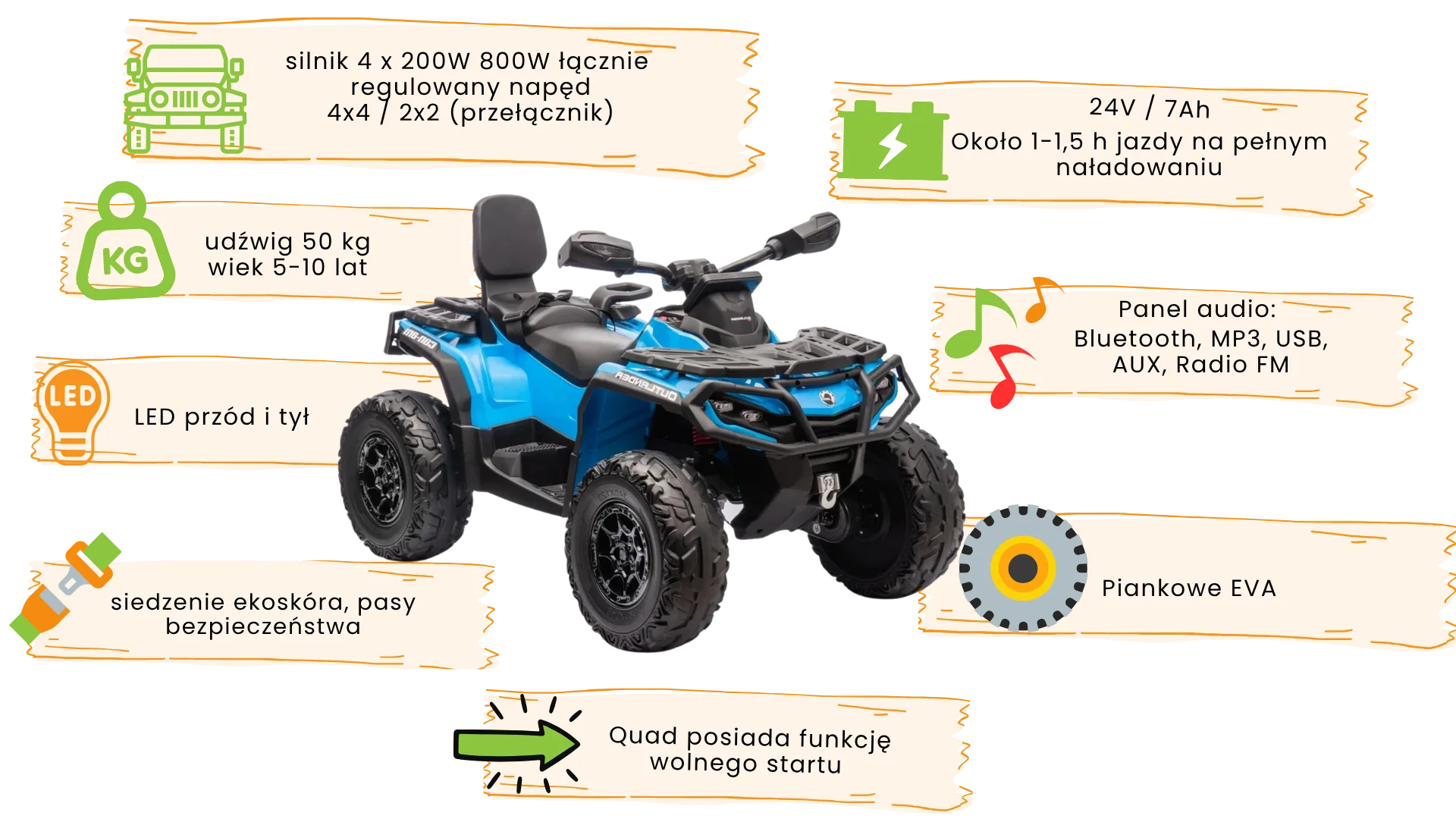 Quad Elektryczny Dla Dzieci - Can-Am Outlander 4x200W, 24V/7Ah ATV 4x4 - Kolor Niebieski