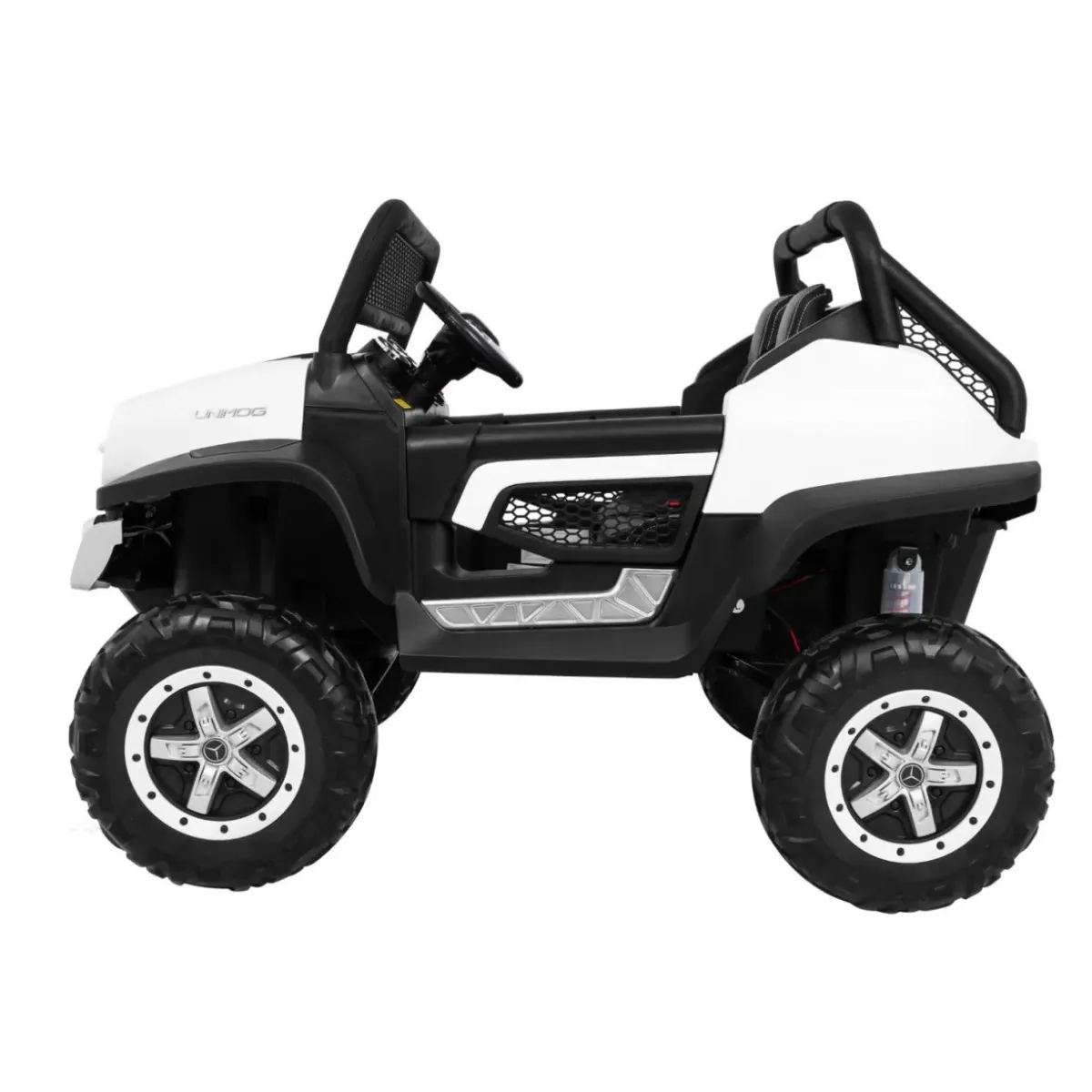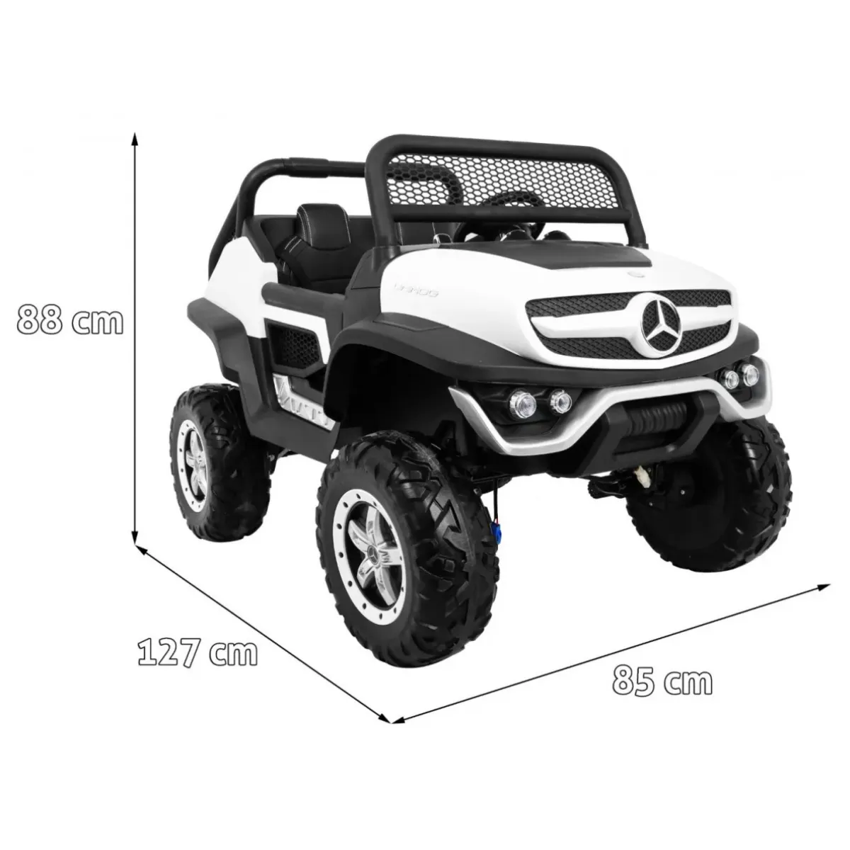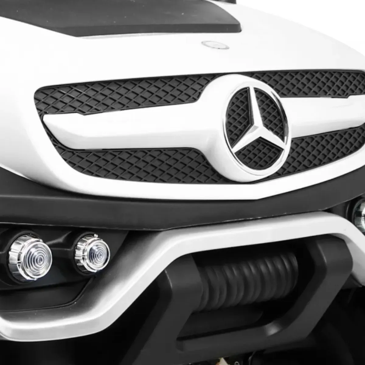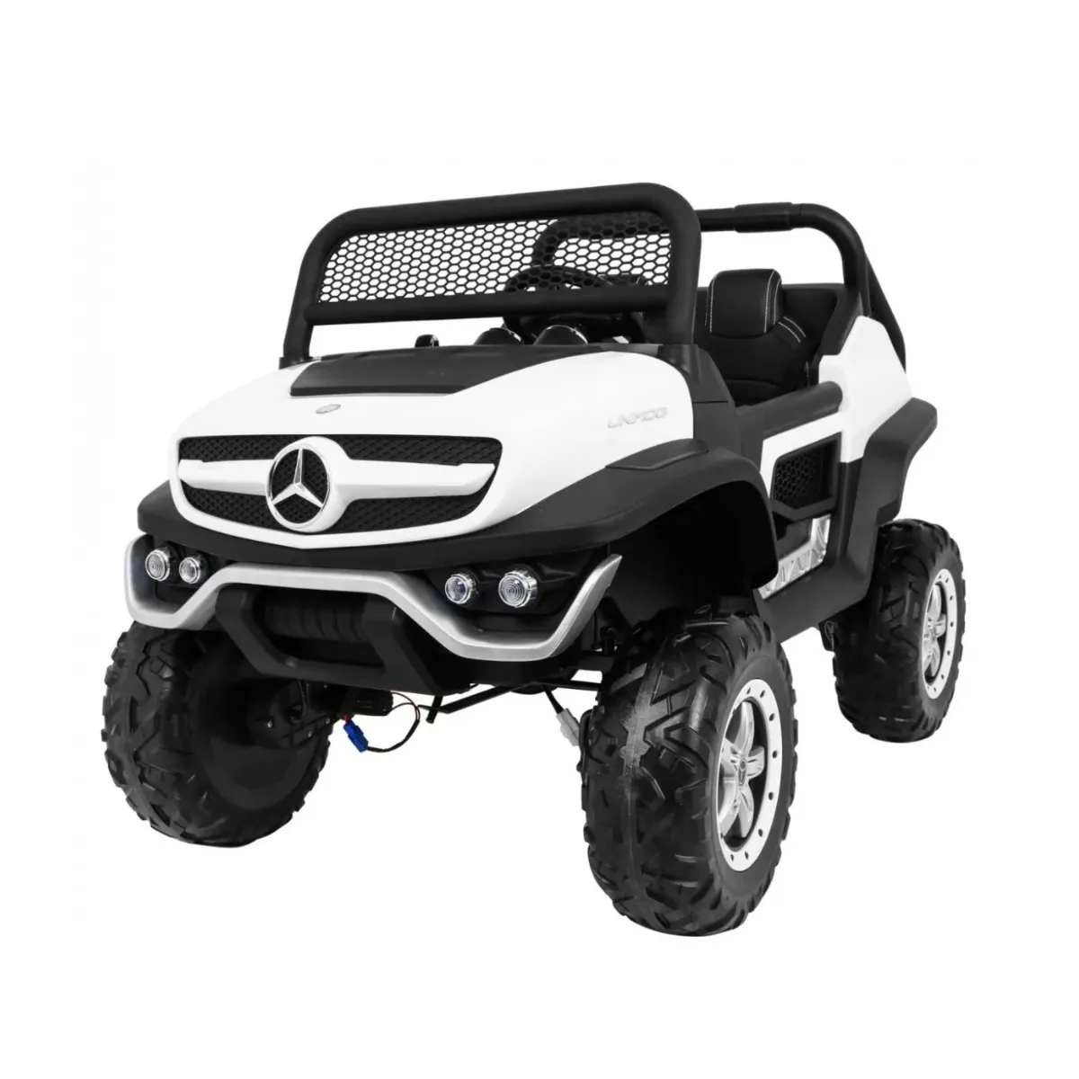Samochód elektryczny dwuosobowy Mercedes UNIMOG in kolorze białym to idealny wybór dla rodzin ceniących elegancję, klasykę i luksusowy wygląd. Biały to kolor premium - pasuje do zadbanych ogrodów, eleganckich działek, rodzin dbających o estetykę otoczenia.