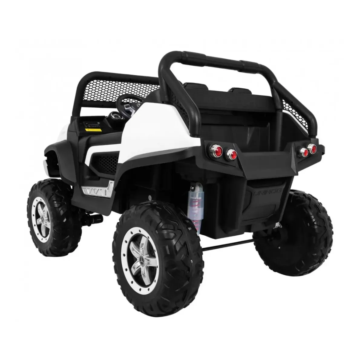 Ten samochód terenowy dla dzieci w klasycznym, białym kolorze to połączenie elegancji premium z ekstremalnymi możliwościami terenowymi. Mercedes UNIMOG wyposażony w 4 silniki 10000 RPM z przełącznikiem napędu 2WD/4WD, akumulator 12V/14Ah, koła EVA 37 cm oraz regulowane zawieszenie tylne to prawdziwy luksusowy terenowiec. Przeznaczony dla dwójki dzieci od 3 roku życia, z pilotem 2.4GHz z funkcją STOP, panelem audio Bluetooth i bagażnikiem tylnym, łączy elegancję Mercedes-Benz z niezawodnością off-road. Prześwit 27 cm i maksymalne obciążenie 35 kg to gwarancja długich lat zabawy w każdym terenie.