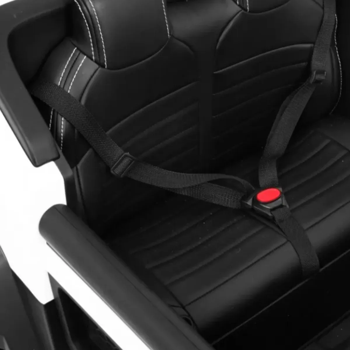 Siedzenie z czarnej ekoskóry (51 x 36 x 22 cm) tworzy elegancki kontrast z białą karoserią - kompozycja znana z prawdziwych limuzyn Mercedes-Benz klasy S czy G. Materiał jest łatwy in czyszczeniu - po błotnistej wyprawie wystarczy przetrzeć wilgotną szmatką. Pasy bezpieczeństwa zapobiegają wyślizgnięciu się podczas jazdy po nierównym terenie. Siedzenie pomieści dwoje mniejszych dzieci (3-6 lat) lub jedno większe (7-10 lat).