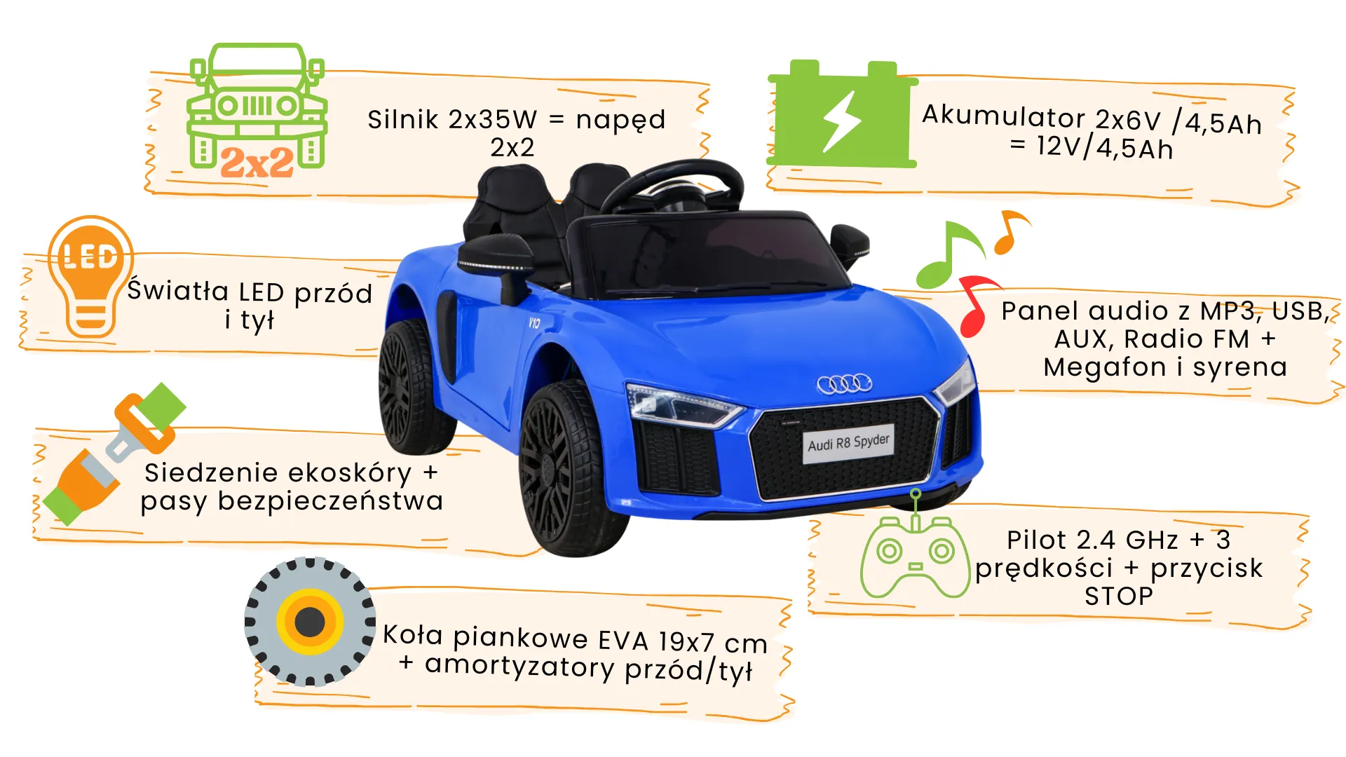 Audi R8 na Akumulator dla Dzieci Niebieski+ Pilot + EVA + Wolny Start + MP3 LED