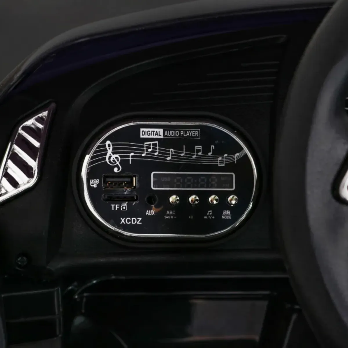 Panel audio w desce rozdzielczej obsługuje wiele formatów i źródeł dźwięku. Wbudowane melodyjki wystarczą na początek, ale możliwość podłączenia własnej muzyki przez USB, kartę SD lub kabel AUX sprawia, że zabawa nie nudzi się przez długie miesiące. Klakson w kierownicy to dodatkowa atrakcja dla małych kierowców.
