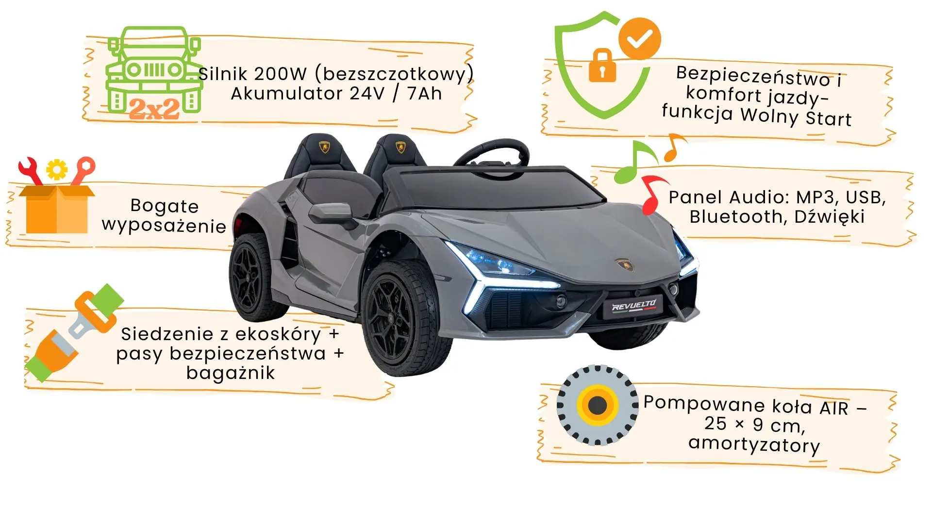 | Lamborghini Revuelto STRONG szary | 200W bezszczotkowy | 24V/7Ah | 2 | Pompowane AIR | Tarczowe + ręczny |