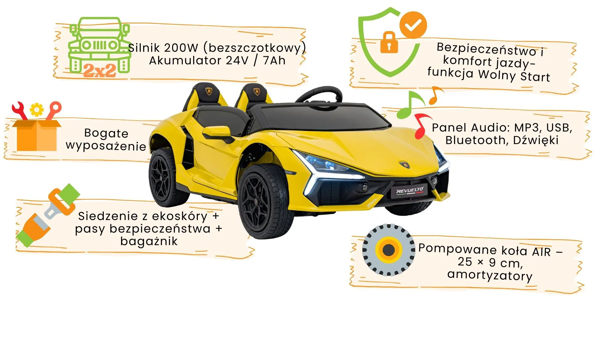 | Lamborghini Revuelto STRONG żółty | 200W bezszczotkowy | 24V/7Ah | 12 km/h | Pompowane AIR | Tarczowe + ręczny |