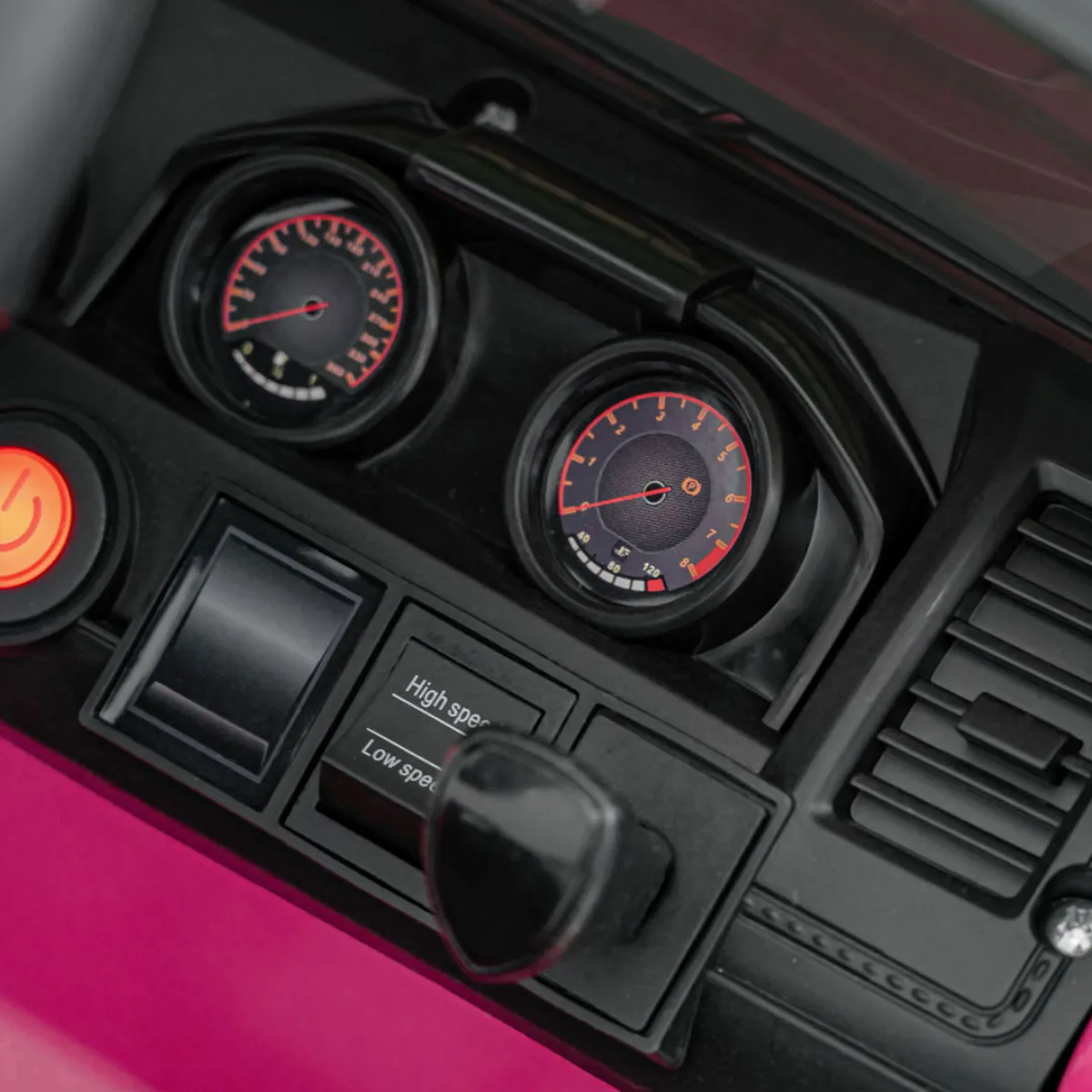 Deska rozdzielcza jest maksymalnie uproszczona i intuicyjna - idealna dla małych dziewczynek dopiero poznających pojazdy. Duże przyciski i wyraźne ikony pozwalają 3-4-latce samodzielnie włączyć światła, klakson czy muzykę bez pomocy rodzica. Kierownica ma mniejszą średnicę (dostosowana do małych rąk) i jest lekko wyprofilowana, co ułatwia trzymanie podczas jazdy po nierównościach. Pod kierownicą znajdują się dwa główne przyciski: światła LED i klakson - dziewczynka łatwo je rozróżnia i pamięta.