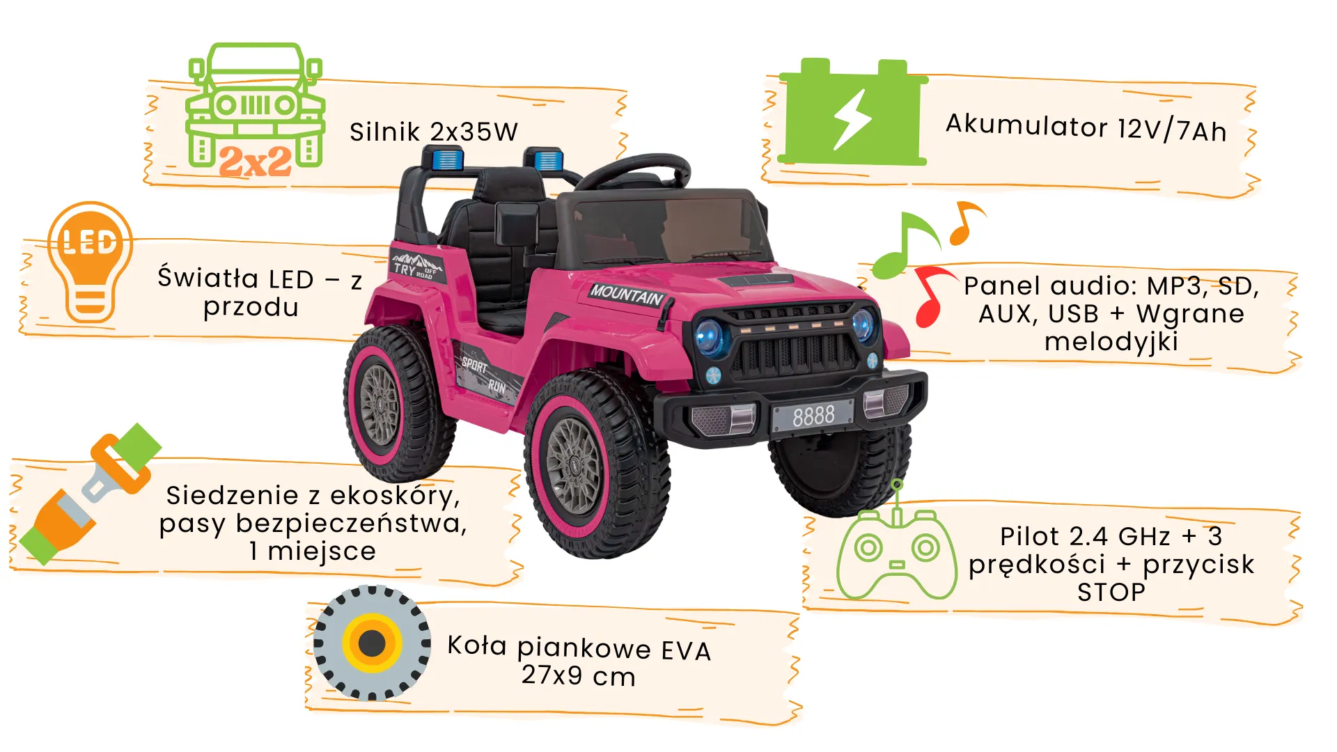 Szukasz pojazdu terenowego dla dziewczynki, który łączy delikatny wygląd z prawdziwymi możliwościami terenowymi? Różowy Off Road MOUNTAIN to terenówka stworzona dla małych odkrywczyń w wieku 3-6 lat, które cenią zarówno kobiecy styl, jak i przygodę. Dwa silniki 35W, wysokie koła EVA (27 cm średnicy) i prześwit 15 cm sprawiają, że ten pojazd radzi sobie zarówno na asfalcie, kostce brukowej, jak i trawie. Delikatna różowa kolorystyka nadaje mu dziewczęcy charakter, wyróżniając się na tle typowych terenówek w ciemnych barwach. Pilot 2.4GHz z przyciskiem STOP daje rodzicom pełną kontrolę, wolny start eliminuje szarpnięcia, a wygodne siedzenie z ekoskóry zapewnia komfort podczas każdej wyprawy. Panel multimedialny USB/AUX/SD pozwala odtwarzać ulubioną muzykę, a światła LED dodają realizmu. Maksymalne obciążenie 25 kg i czas jazdy 1-1,5 godziny gwarantują długą zabawę dla małych dziewczynek rozpoczynających przygodę z motoryzacją.
